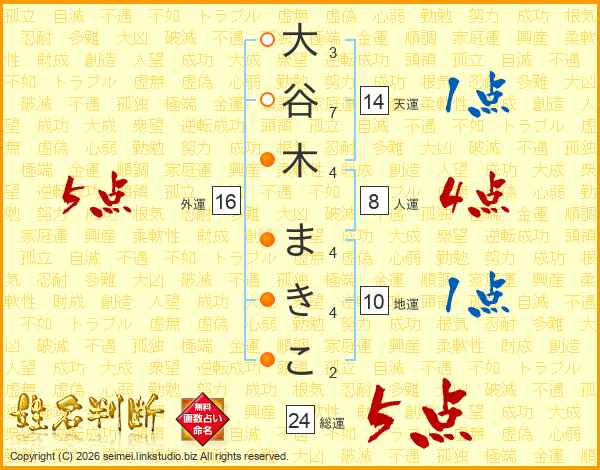大(3画)谷(7画)木(4画) ま(4画)き(4画)こ(2画)