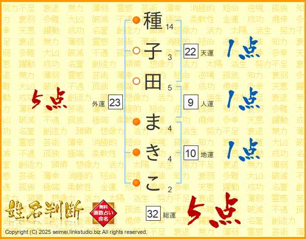 生活面を象徴する運勢です。外部から受ける影響力を表し、結婚運、家庭運や職場、環境への順応性を表します。総運から人運を引いた画数。姓や名が1文字の場合を除く。