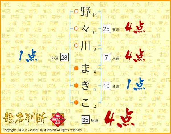 生活面を象徴する運勢です。外部から受ける影響力を表し、結婚運、家庭運や職場、環境への順応性を表します。総運から人運を引いた画数。姓や名が1文字の場合を除く。