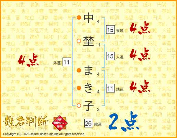 中(4画)埜(11画) ま(4画)き(4画)子(3画)