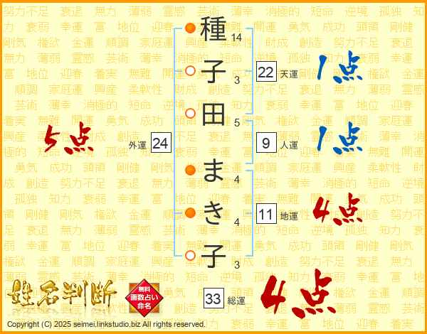 種(14画)子(3画)田(5画) ま(4画)き(4画)子(3画)
