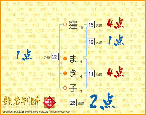 生活面を象徴する運勢です。外部から受ける影響力を表し、結婚運、家庭運や職場、環境への順応性を表します。総運から人運を引いた画数。姓や名が1文字の場合を除く。