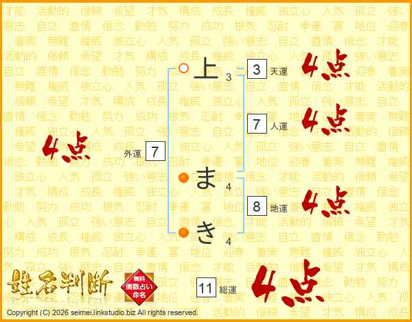 生活面を象徴する運勢です。外部から受ける影響力を表し、結婚運、家庭運や職場、環境への順応性を表します。総運から人運を引いた画数。姓や名が1文字の場合を除く。
