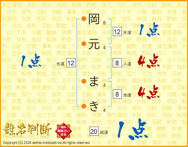 岡(8画)元(4画) ま(4画)き(4画)