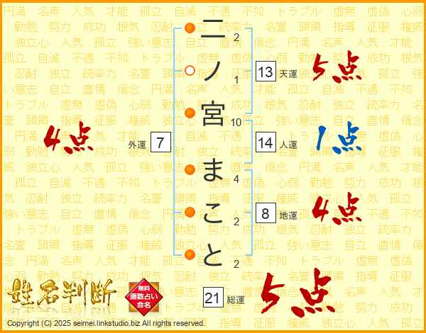 二ノ宮まことさんの総運は21画の5点!