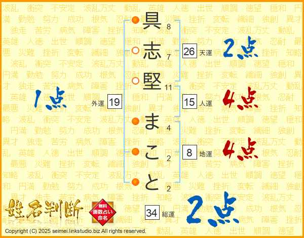 具(8画)志(7画)堅(11画) ま(4画)こ(2画)と(2画)