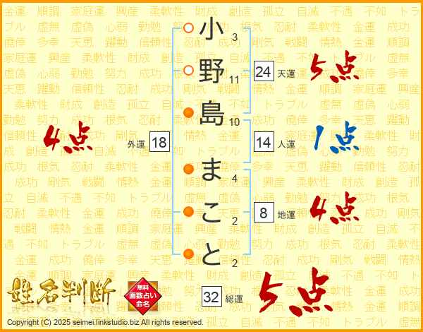 生活面を象徴する運勢です。外部から受ける影響力を表し、結婚運、家庭運や職場、環境への順応性を表します。総運から人運を引いた画数。姓や名が1文字の場合を除く。