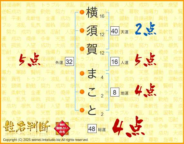 横(16画)須(12画)賀(12画) ま(4画)こ(2画)と(2画)