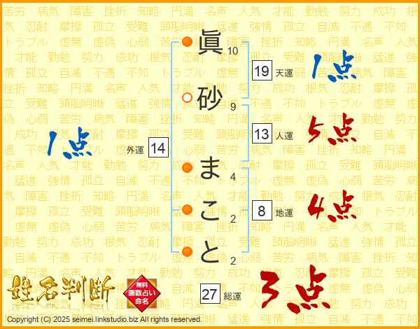 眞(10画)砂(9画) ま(4画)こ(2画)と(2画)