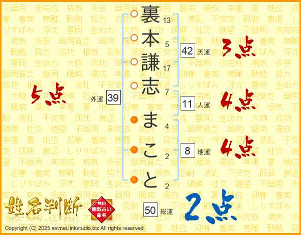 裏(13画)本(5画)謙(17画)志(7画) ま(4画)こ(2画)と(2画)