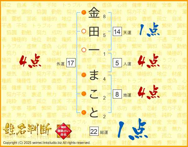 金(8画)田(5画)一(1画) ま(4画)こ(2画)と(2画)