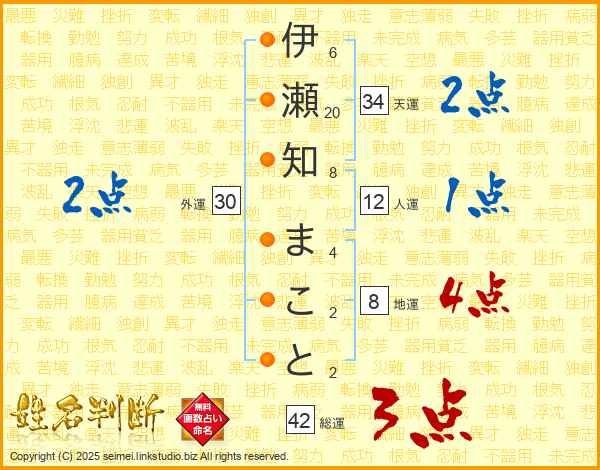 伊(6画)瀬(20画)知(8画) ま(4画)こ(2画)と(2画)