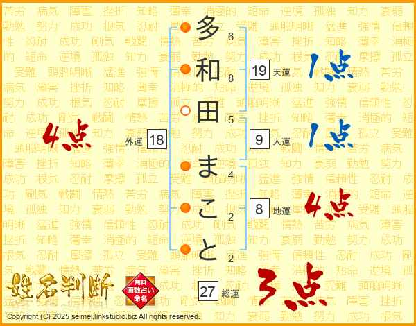 生活面を象徴する運勢です。外部から受ける影響力を表し、結婚運、家庭運や職場、環境への順応性を表します。総運から人運を引いた画数。姓や名が1文字の場合を除く。
