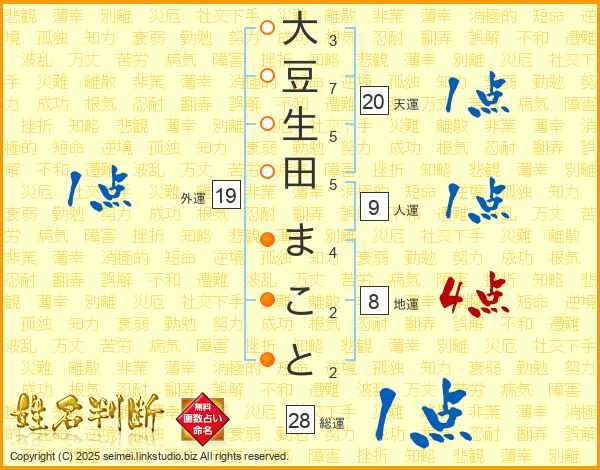大豆生田まことさんの総運は28画の1点!