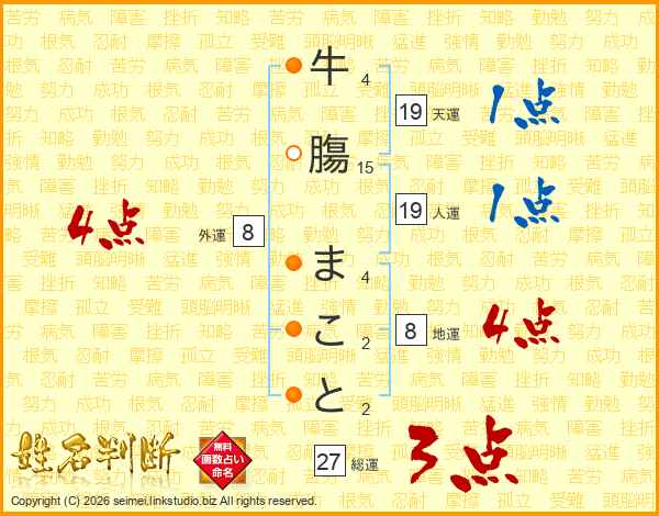 牛(4画)膓(15画) ま(4画)こ(2画)と(2画)