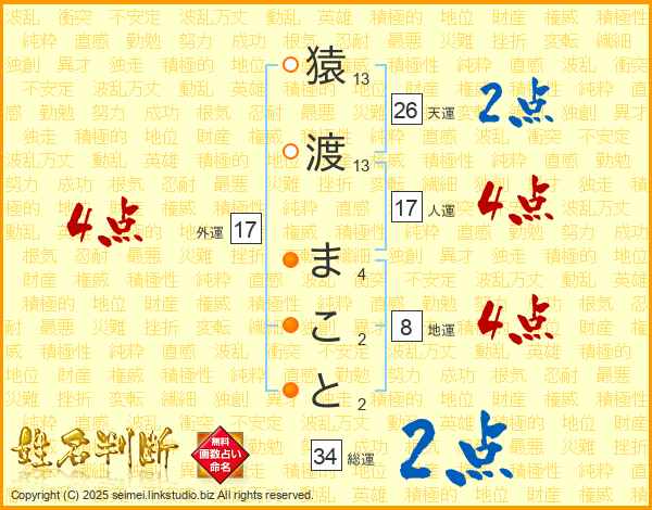 猿(13画)渡(13画) ま(4画)こ(2画)と(2画)
