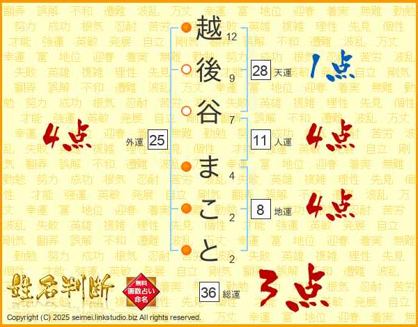 越(12画)後(9画)谷(7画) ま(4画)こ(2画)と(2画)