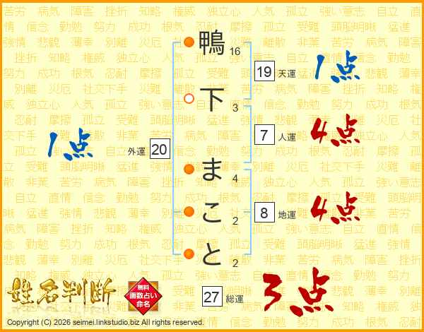 鴨(16画)下(3画) ま(4画)こ(2画)と(2画)