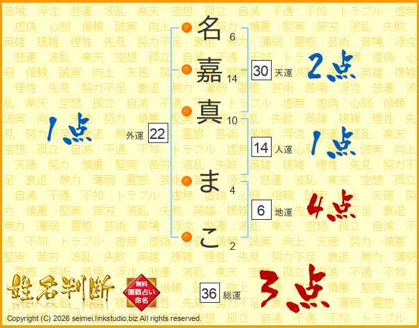 名(6画)嘉(14画)真(10画) ま(4画)こ(2画)