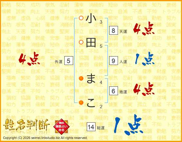 生活面を象徴する運勢です。外部から受ける影響力を表し、結婚運、家庭運や職場、環境への順応性を表します。総運から人運を引いた画数。姓や名が1文字の場合を除く。