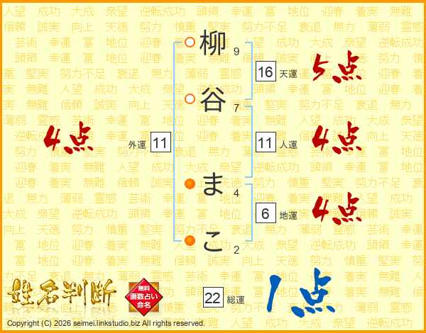 柳(9画)谷(7画) ま(4画)こ(2画)