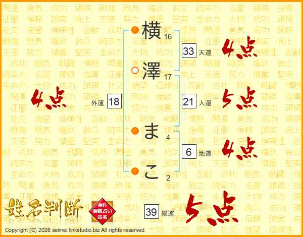 あなたの人生を表す1番重要な運勢です。生涯を通じて影響する総合運となり、主に50歳以降の晩年期に影響を及ぼします。苗字と名前の合計画数。