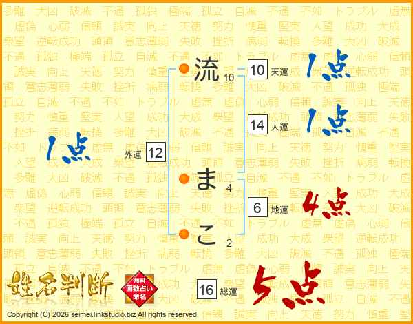 生活面を象徴する運勢です。外部から受ける影響力を表し、結婚運、家庭運や職場、環境への順応性を表します。総運から人運を引いた画数。姓や名が1文字の場合を除く。
