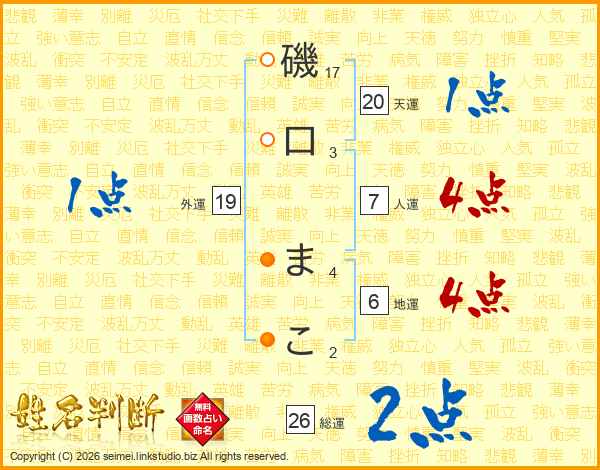 生活面を象徴する運勢です。外部から受ける影響力を表し、結婚運、家庭運や職場、環境への順応性を表します。総運から人運を引いた画数。姓や名が1文字の場合を除く。