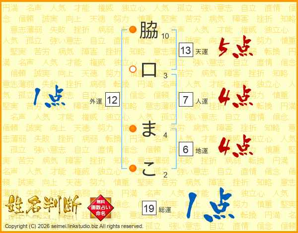 生活面を象徴する運勢です。外部から受ける影響力を表し、結婚運、家庭運や職場、環境への順応性を表します。総運から人運を引いた画数。姓や名が1文字の場合を除く。