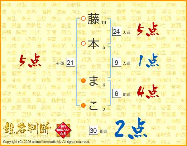 あなたの人生を表す1番重要な運勢です。生涯を通じて影響する総合運となり、主に50歳以降の晩年期に影響を及ぼします。苗字と名前の合計画数。