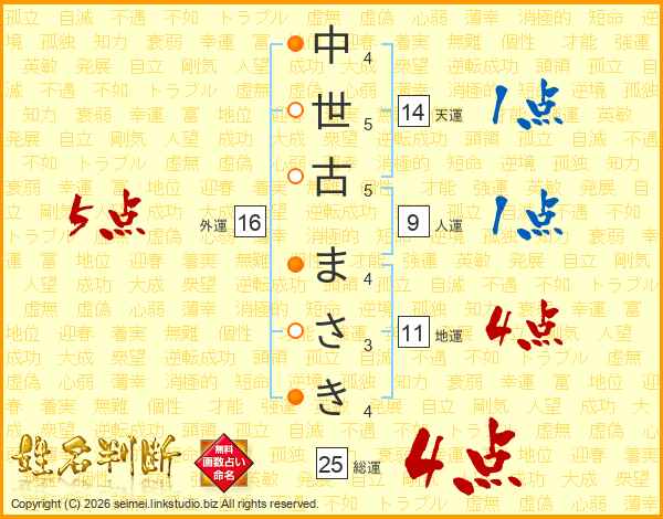 中(4画)世(5画)古(5画) ま(4画)さ(3画)き(4画)