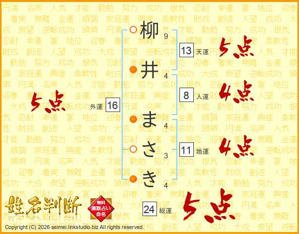 柳(9画)井(4画) ま(4画)さ(3画)き(4画)