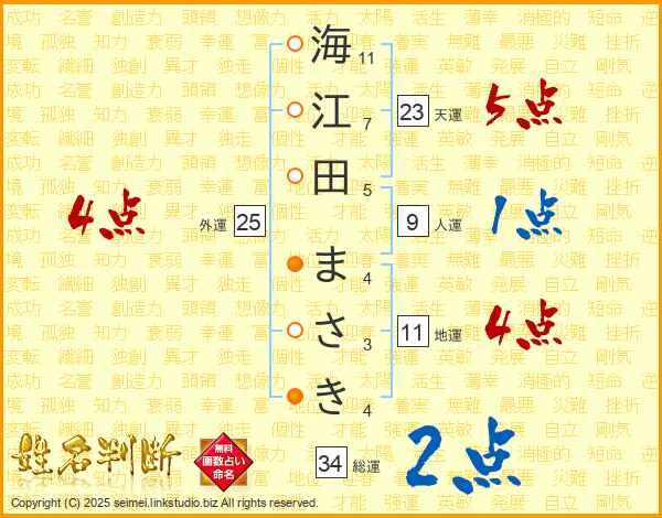 生活面を象徴する運勢です。外部から受ける影響力を表し、結婚運、家庭運や職場、環境への順応性を表します。総運から人運を引いた画数。姓や名が1文字の場合を除く。