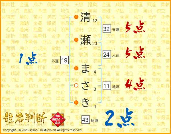 清瀬まさきさんの総運は43画の2点!