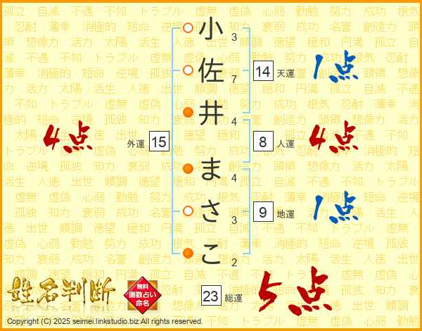 生活面を象徴する運勢です。外部から受ける影響力を表し、結婚運、家庭運や職場、環境への順応性を表します。総運から人運を引いた画数。姓や名が1文字の場合を除く。
