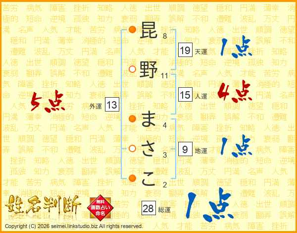 昆(8画)野(11画) ま(4画)さ(3画)こ(2画)