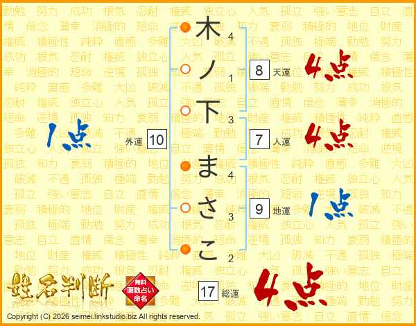 木(4画)ノ(1画)下(3画) ま(4画)さ(3画)こ(2画)