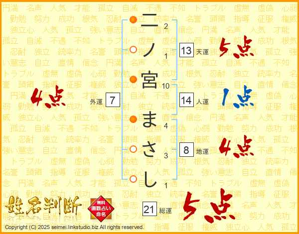 二ノ宮まさしさんの総運は21画の5点!