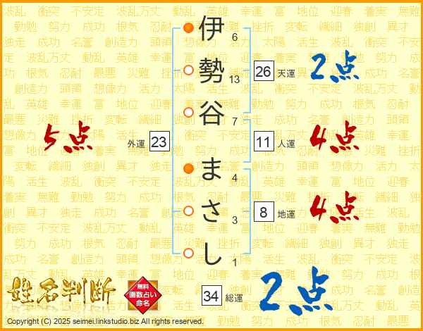 伊(6画)勢(13画)谷(7画) ま(4画)さ(3画)し(1画)