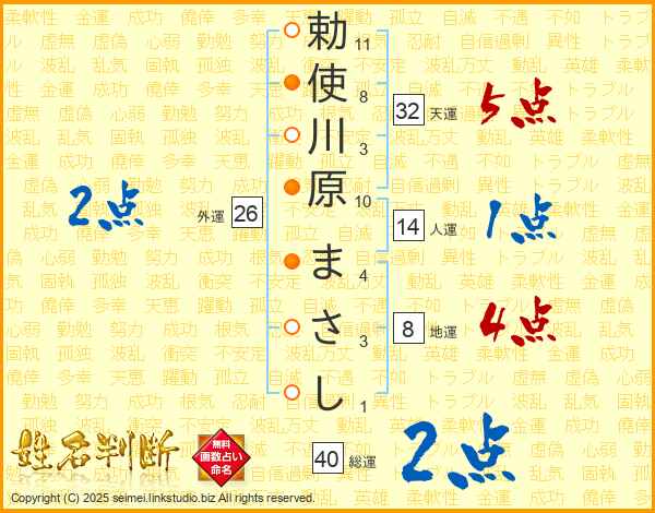 生活面を象徴する運勢です。外部から受ける影響力を表し、結婚運、家庭運や職場、環境への順応性を表します。総運から人運を引いた画数。姓や名が1文字の場合を除く。