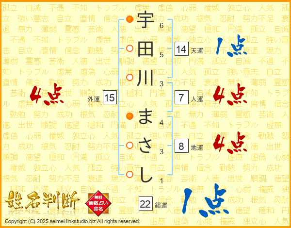 生活面を象徴する運勢です。外部から受ける影響力を表し、結婚運、家庭運や職場、環境への順応性を表します。総運から人運を引いた画数。姓や名が1文字の場合を除く。