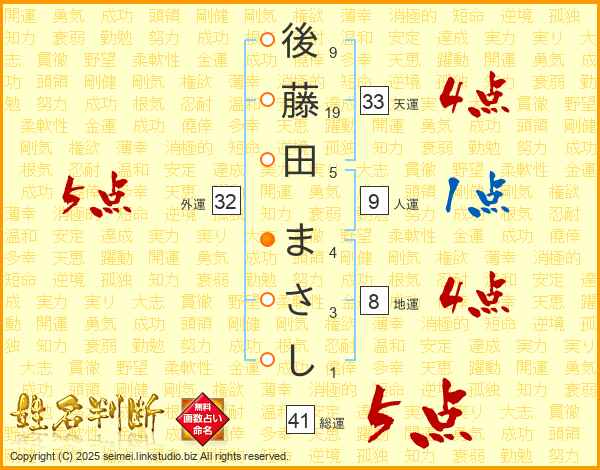 後(9画)藤(19画)田(5画) ま(4画)さ(3画)し(1画)