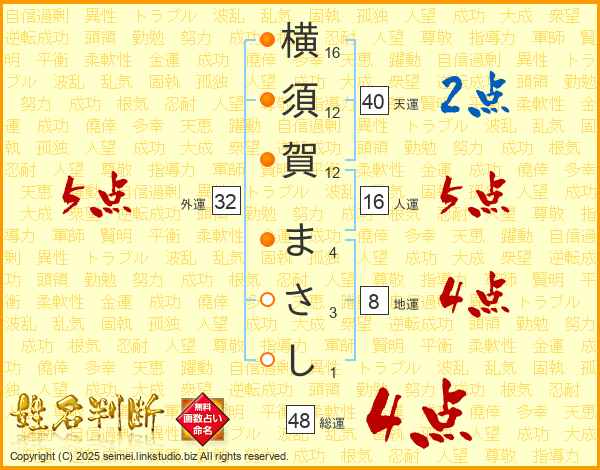 横(16画)須(12画)賀(12画) ま(4画)さ(3画)し(1画)