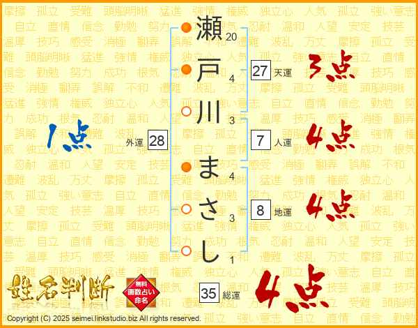 瀬(20画)戸(4画)川(3画) ま(4画)さ(3画)し(1画)