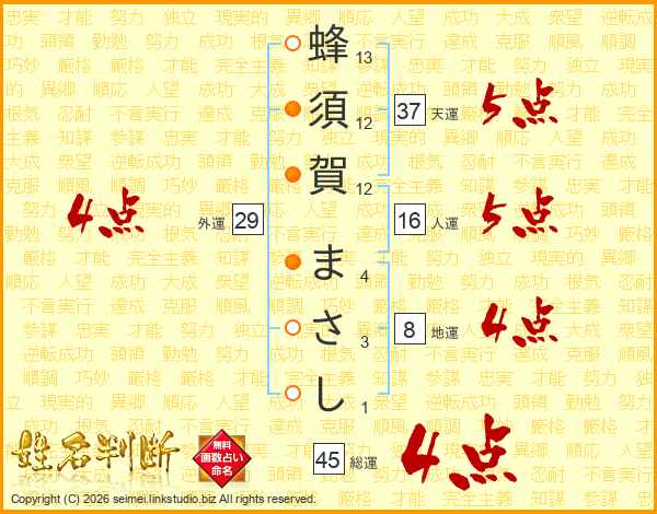蜂(13画)須(12画)賀(12画) ま(4画)さ(3画)し(1画)