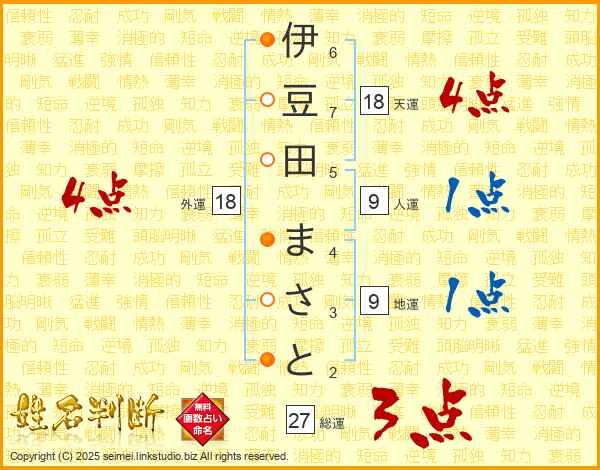 伊豆田まさとさんの総運は27画の3点!