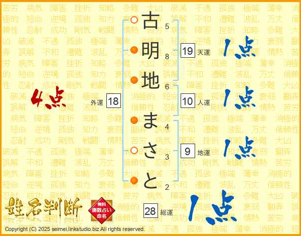 古(5画)明(8画)地(6画) ま(4画)さ(3画)と(2画)