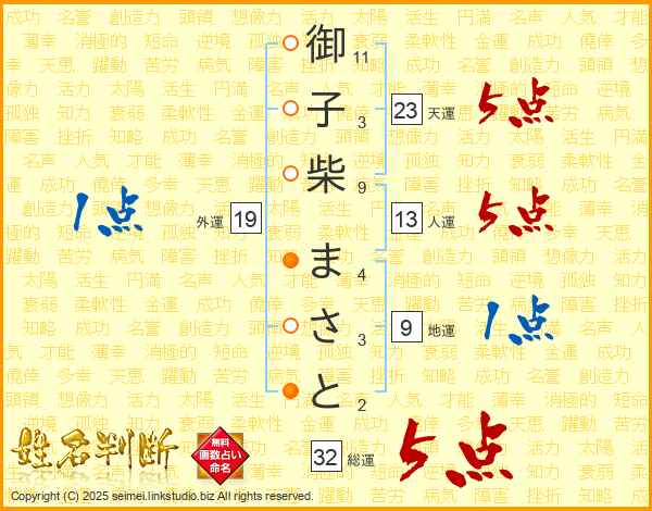 御(11画)子(3画)柴(9画) ま(4画)さ(3画)と(2画)
