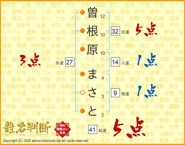 曽根原まさとさんの総運は41画の5点!