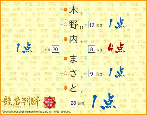 木(4画)野(11画)内(4画) ま(4画)さ(3画)と(2画)